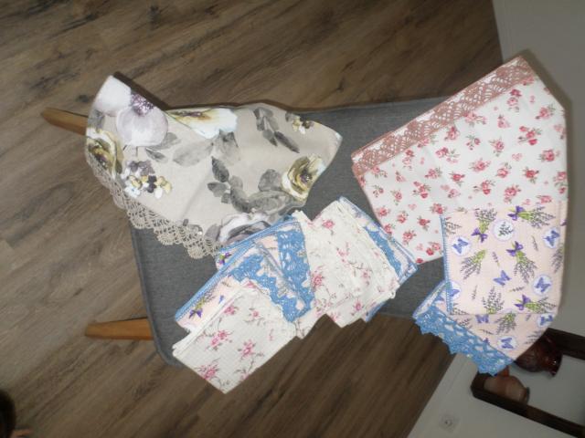 Ranku darbo autoriniai, vienetiniai,- lininiai, medvilniniai dirbiniai. Tase- kiek naudota, suknele- kiek naudota, pakaba su "veltinukais", ranksluosciai (medvilniniai, lininiai) ivairiu dydziu- visiskai nauji. Aukstos kokybes ir individualus gaminiai. Kaina sutarttine, ranksluosciai 7e.