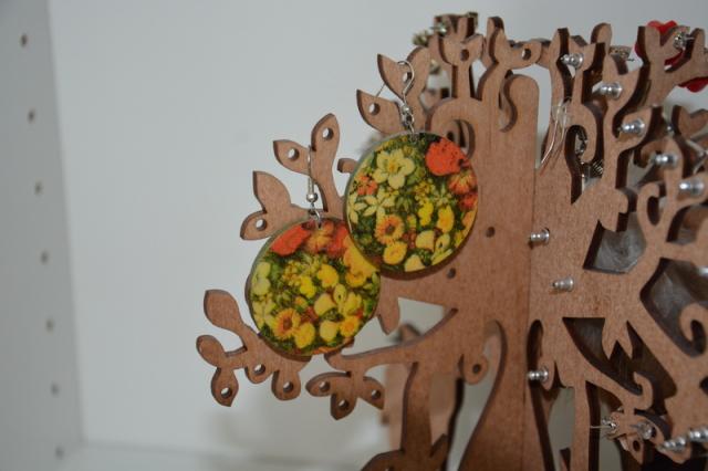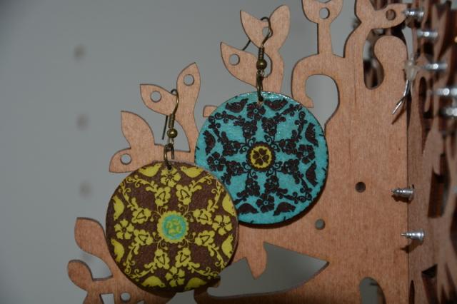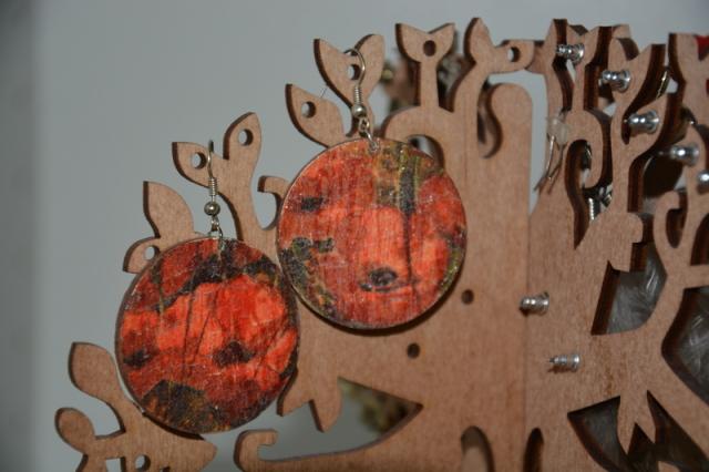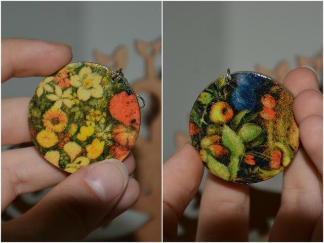 Parduodu rankų darbo, medinius, dekupažinius auskarus :) Skersmuo ~2cm. Kiekvieno auskaro pusės skirtingos, todėl atrodys originaliai :) Kiekvienos poros kaina 7,00 LT