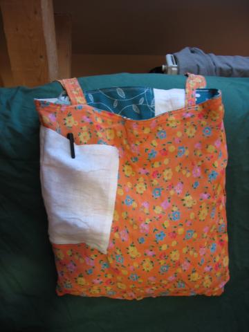 Rankų darbo dvipusė rankinė. Jeigu atsibos viena pusė, galima išversti į kitą. Yra kišenės tušinukui ir užrašų knygutei.