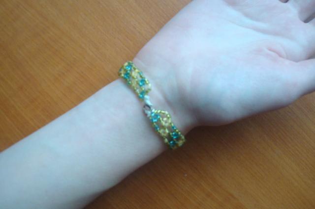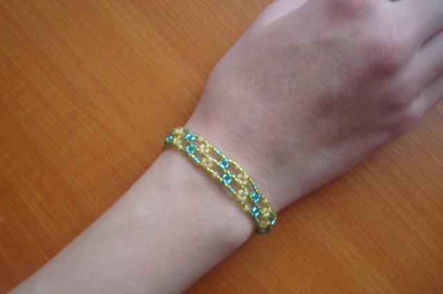 Rankų darbo geltona apyrankė su gėlytėmis. Kokybiška, nenešiota.