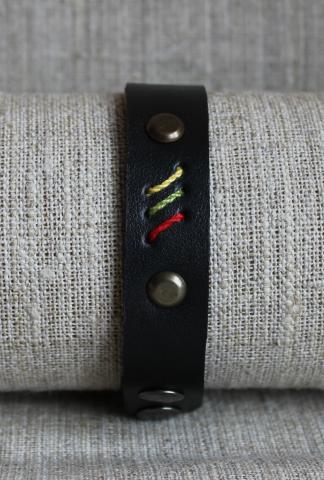 Rankų darbo juoda odinė apyrankė, dekoruota juoda pinta virvele ir lietuviškais motyvais. Apyrankė puikiai dera prie originalaus Jūsų stiliaus, tinka siekiantiems subtilaus išskirtinumo. Lietuviškais motyvais dekoruotas aksesuaras – išskirtinė dovana tiek Lietuvoje, tiek svečiose šalyse gyvenantiems draugams. Plotis: 12 mm Užsegimo tipas: spaudės Sudėtis: natūrali oda, medvilniniai siūlai, kniedės Gaminame pagal individualius užsakymus. Daugiau odinių gaminių www.evaleath.lt