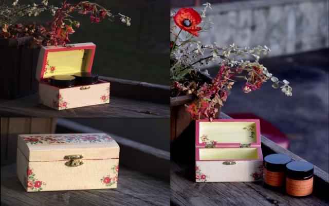 Natūralus rankų darbo kremas/kūno sviestas medinėje dekupažuotoje dėžutėje "Raudonosios gėlelės". Du indeliai po 50 ml (2x 50 =100 ml). Naudojamas tiek vaikų, tiek suaugusių odos drėkinimui, saugo nuo šalčio, saulės, sausėjimo, tinka lūpoms. Puiki dovana! Komplektuko kaina 65 lt.