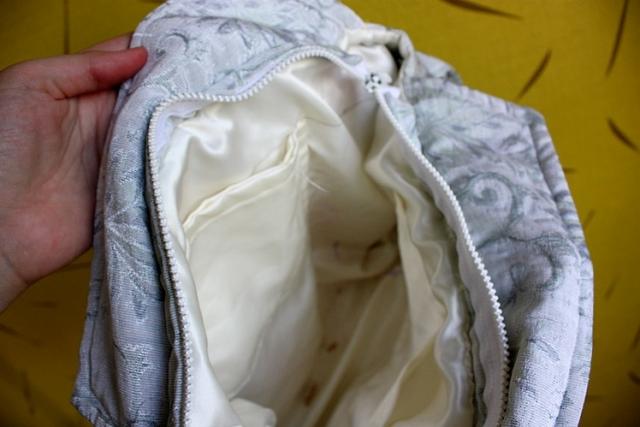 Nauja. Man labai patiko, nes atrodė tokia Vintage, bet paskui kažkaip prie savo garderobo nebepriderinau. Susisega užtrauktuku, viduje yra keli mažesni skyreliai. Atrodo gana puošniai.