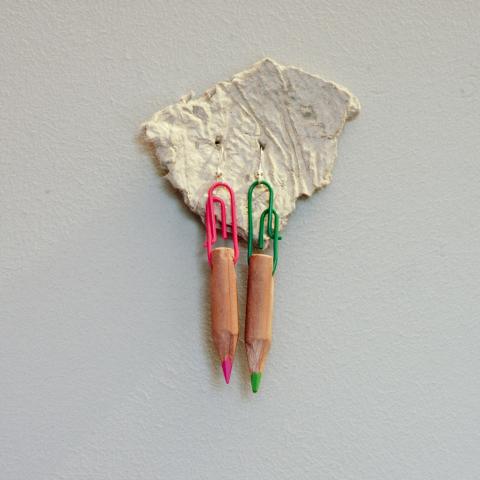 Rankų darbo nestandartiniai auskarai su pasidabruotom auselėm. Tikri eko stiliaus pieštukai - ne imitacija, spalvoti! MIelai mainau į vertingus man patikusius daiktus, mainams vertė kiek didesnė. :)
