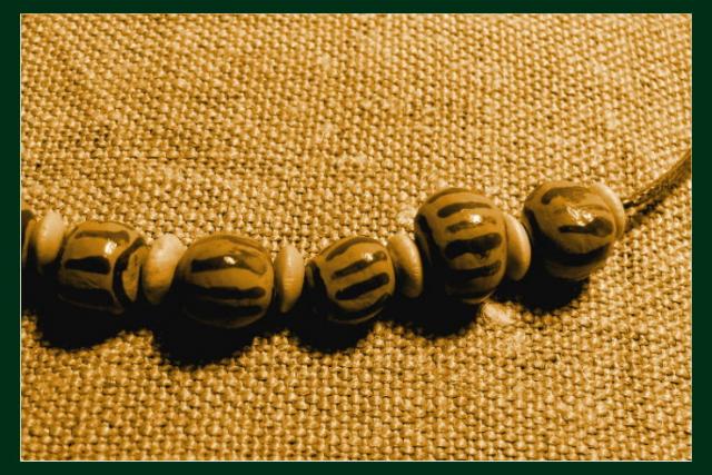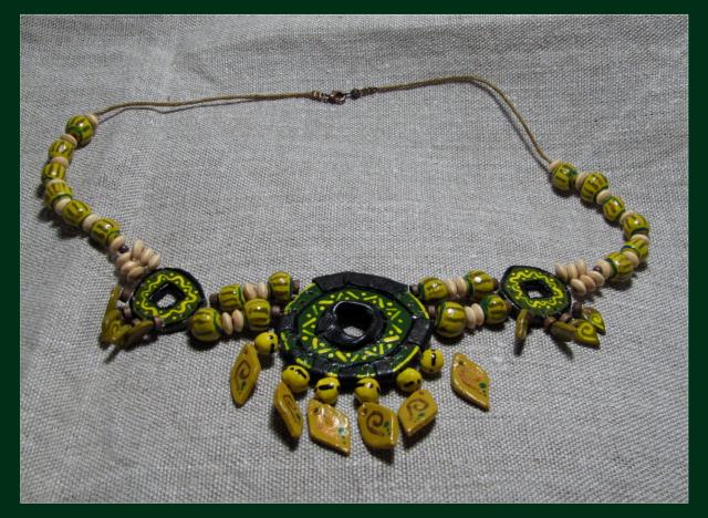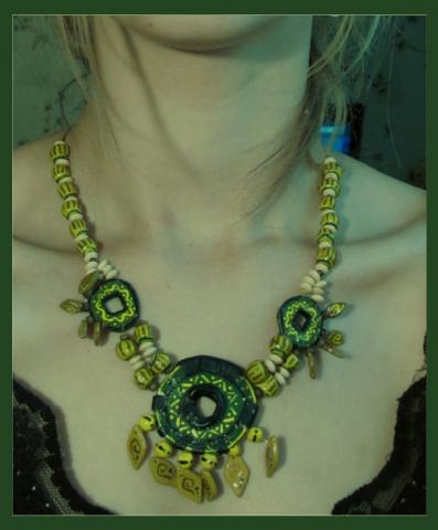 Visas ilgis: 27,5 cm Pakabukas: 4,5 cm (pagrindinio apskritimo skersmuo) Materijos: medis, modelinas, oda,