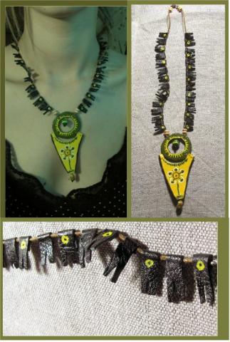 Visas ilgis: 31cm Pakabukas: 10 cm Materijos: medis, modelinas, oda