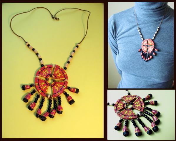Visas ilgis: 31,5 cm Pakabukas: 9,1 cm Materijos: medis, modeinas, stiklo karoliukai, oda
