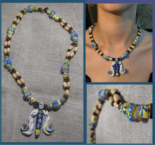 Visas ilgis: 27 cm Pakabukas: 5 cm Materijos: medis, modelinas, lavos akmuo