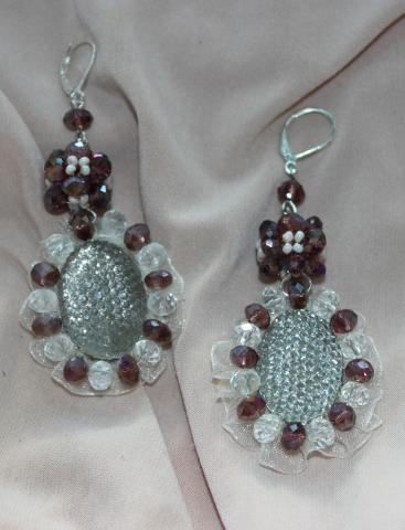 Rankų darbo auskarai su sidabriniais užsegimais. Bendras ilgis 8,5 cm.