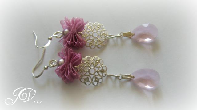 Čekiškas stiklas, ažurinės detalės, stiklo perliukai, organza, pasidabruoti auskarų kabliukai.