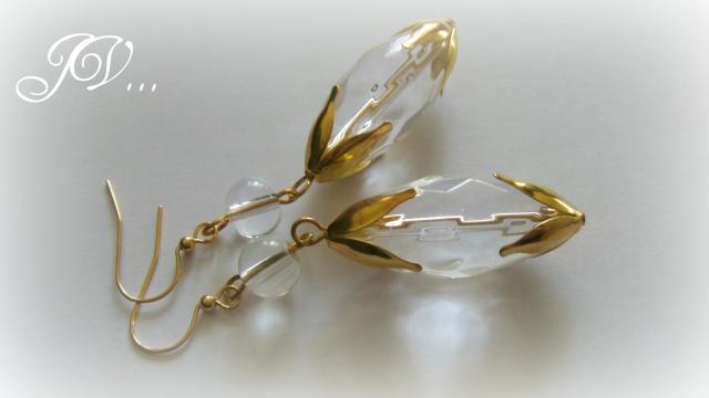 Akrilas, paauksuotos detalės, čekiškas stiklas, paauksuoti auskarų kabliukai.