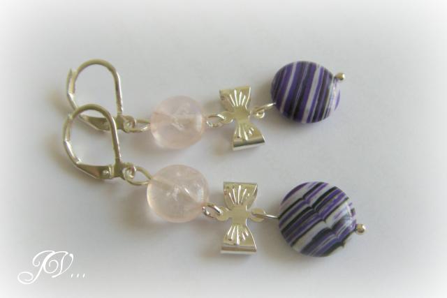 Holvitas, rožinis kvarscas, pasidabruoti kaspinėliai, pasidabruotas auskarų užsegimas.