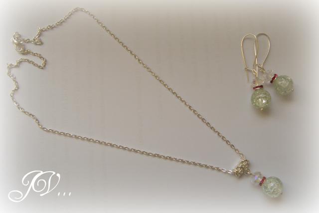 Daužtas stiklas, swarovski kristalai, intarpai su akutėmis, pasidabruotas auskarų užsegimas, pasidabruota 45cm ilgio grandinėlė. Kaina auskariukų 12Lt, pakabuko 10Lt.