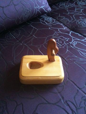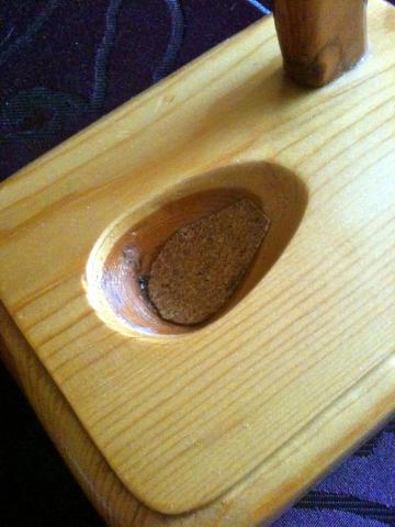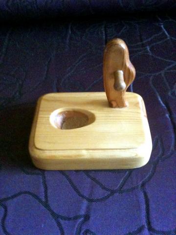 Šviesaus medžio, rankų darbo pypkės stovas, nulakuotas. Pypkės galvai padėti skirtoje duobutėje kamštinė medžiaga, kad pypkė neslystų ir kad stovas nekaistų. Nenaudota.
