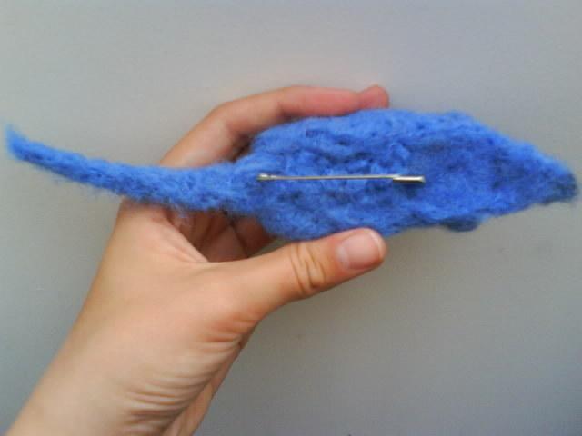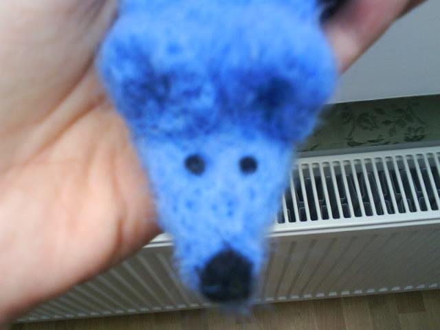 Mano daryta sagė - pelytė. Velta iš šviesiai mėlynos vilnos.
