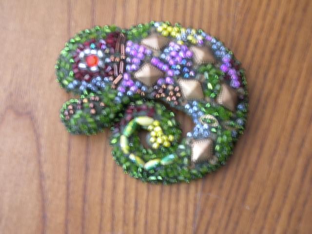 Pagaminta iš natūralios tamsiai žalios spalvos odos, karoliukų. Išmatavimai: ilgis - 8,5 cm, plotis - 7 cm.