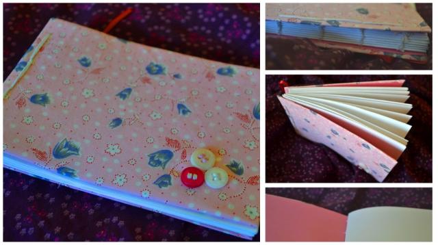 10x15cm dydžio rankų darbo užrašų knygutė, kurios viršelis aptrauktas rausva gėlėta medžiaga. Visi 48 puslapiai yra balti, susiūti baltu siūlu.