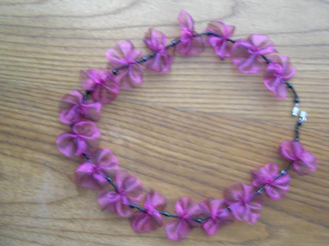 Pagaminta iš rožinio šilko, karoliukų. Ilgis - 49 cm.