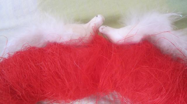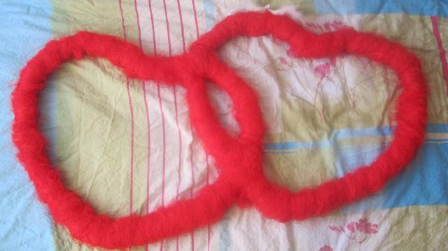 Širdys tikrai nėra mažos, nebus tokių kurie jų nepastebės... :) Pagrindas metalinis, toliau buvo dėtas paminkštinimas, klijuotas popierius tampomas ir floristinis plaušas dėtas ant viršaus.... Naudotas keliose vestuvėse, bet defektų neturi tikrai. Su patikimais žmonėmis būtų galima gal ir apie nuomą pakalbėti... :) Paskutinei foto parodyta kaip galima tą plaušą praskleidus tvirtinti su lipnia dvipuse juostele, taip pat galima rišti su žilka ar prišaudyti su kabėm... Galėsiu atsiųsti foto kaip tą širdį fotos
