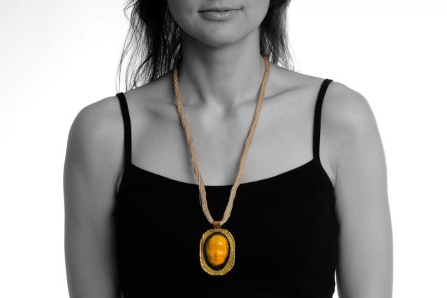 Rankų darbo žalvarinis kaklo papuošalas. Su keramika. Pakabintas ant rankų darbo lininės virvutės.