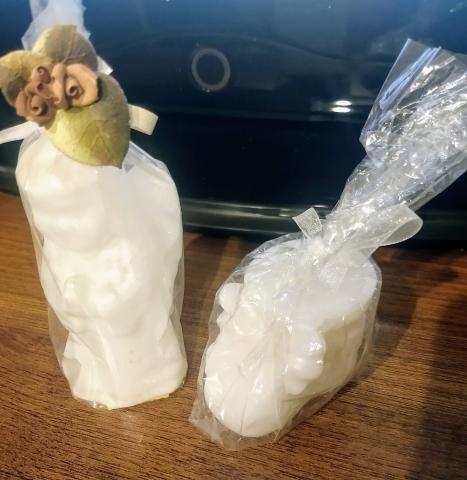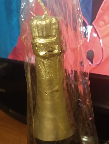 Naujos žvakės. Angeliukas, batelis, šampano butelis.