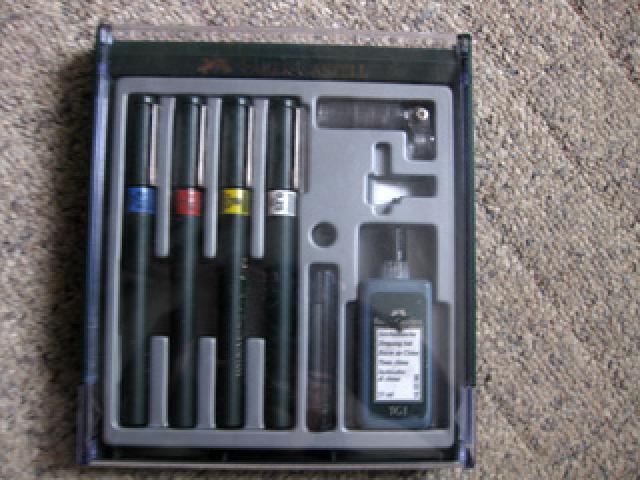 "Faber Castel" braižybai ranka skirti rašaliniai įrankiai. 0,25 (nuluzęs brėžtukas, reikia keisti tik vieną dalį, pardavime tikrai yra); 0,35; 0,5; 0,7 (mm); spec. rašalas, priedai. Plastikinėje patvarioje dėžutėje. Kaip nauji. Klausimai - google