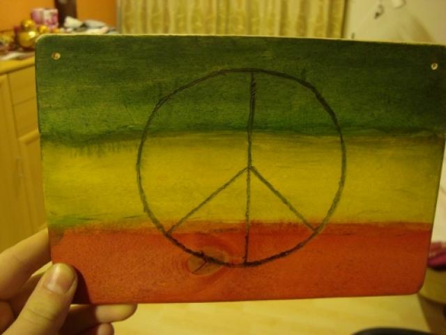 Rastamaniškas,hipiškas,ganjamaniškas pakabukas,gana didelis : D rankų darbo žinoma,pagrindas iš fanieros,stačiakampio formos,viršutiniuose kampuose yra skilutės,galima praverti siūlą or something.galima papuošti kambarį,