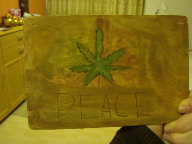 galima ir ant kaklo užsikabint,tik reik fantazijos turėt ir bus labai geras daiktas : D. Pirmoj pusėj rastamanų vėliava su "peace" ženklu,antroj kanapė su po apačia žodžiu "peace"
