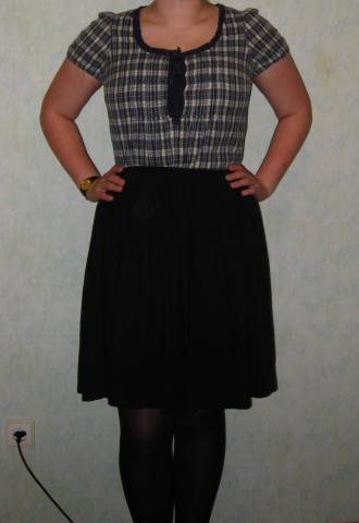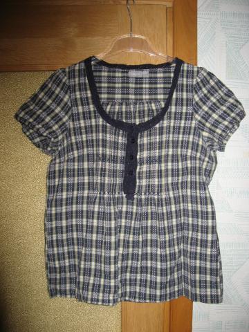 zaliai-melynai languota palaidine. Su nėriniukais aplink apykaklę. Be defektu