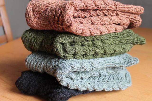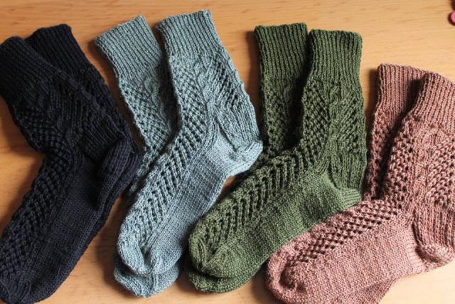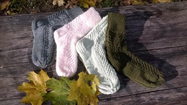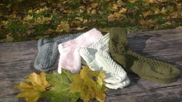 Rankomis megztos šiltos kojinės su puošniu raštu. Tinka ~37 dydžio pėdai.