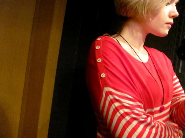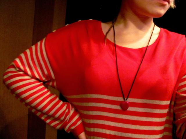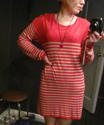 Raudona-balta dryzuota suknele
