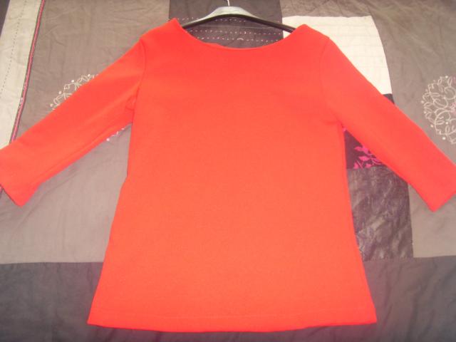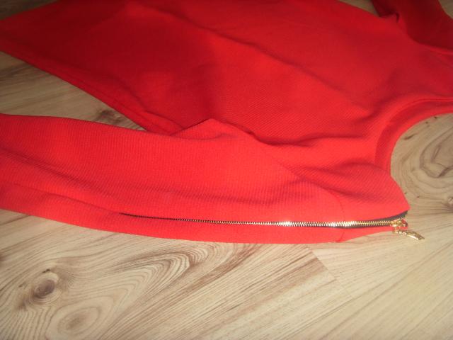 Raudona bliuskute su uztrauktukais rankovese.