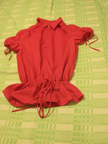 Palaidinė ryškiai raudona, gražiai dera su siaurom kelnėm arba siauru sijonu, susitraukia ties juosmeniu ir rankovės. Sagutės iki pat kaklo, galima užrišt bantuką arba nešiot viršuj truputį prasegtą, defektų nėra.
