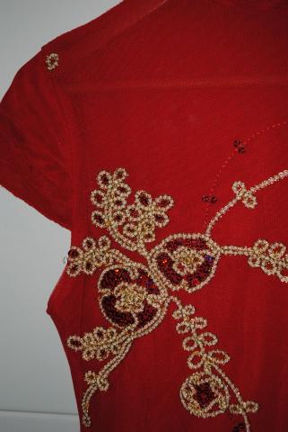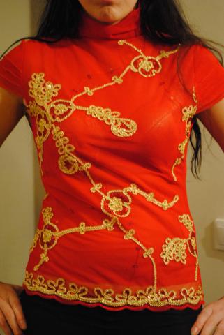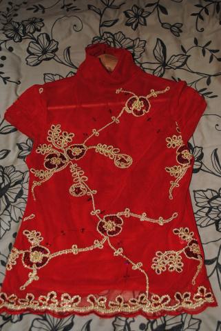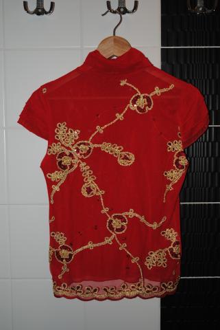 Dėvėta tik vienai progai, ryškiai raudona su raštais maikute. Puošni ir nekasdieniška.Tinka ypatingam vakarui:)Dydis tarp S-M
