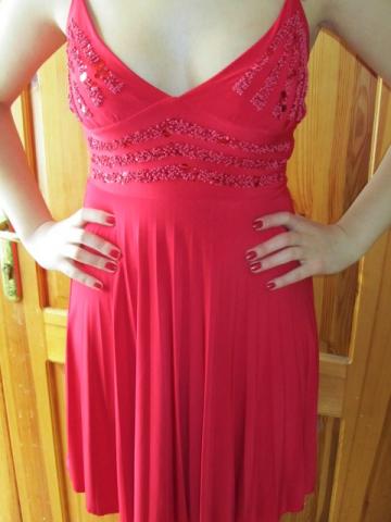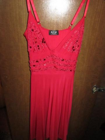 Raudonos spalvos suknelė, ant šleikučių, krutinės srityje papuošta žvyneliais. Apatinė dalis kverbetkuota. Vieną kartą dik dėvėta. Kaina siulykite.