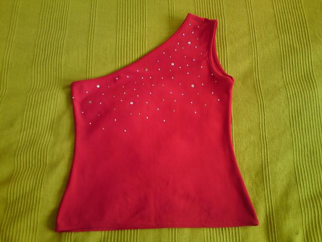 Visiškai nauja ryškiai raudonos spalvos palaidinė per vieną petį. Dydis S. Papuošta metalinėmis blizgančiomis akutėmis.