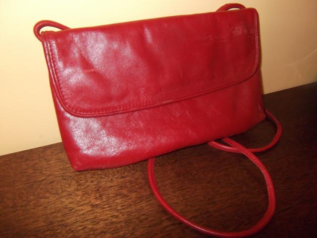 Raudona rankinė su dirželiu. Pirkta Briuselio sendaikčių turguje. Labai minkšta, maloni nešioti.