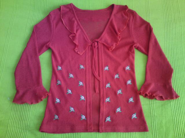 Raudona palaidinė su trijų ketvirčių rankovėmis, surišama priekyje. Puošta gėlytėmis. Medžiaga šiek tiek persišviečia...