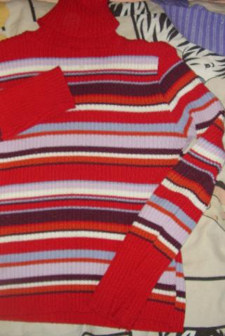 raudonas, dryzuotas megztinis, su apykakle, ilgom rankovem
