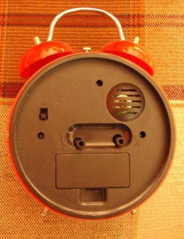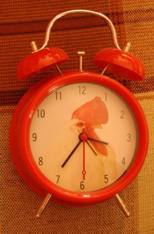 Raudonas nuotaikingas laikrodis, rytais "giedantis" gaidziais. matinimas dviem AA elementais