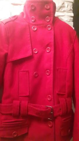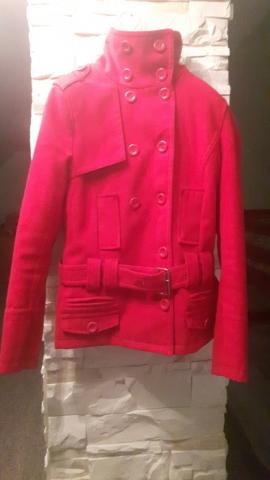 Raudonas paltukas ant saguciu su dirzeliu. Paltukas yra nesiotas ir yra pasiburbuliaves. Ilgis 76cm, krutine 35cm, rankoves ilgis 61cm. +siuntimas
