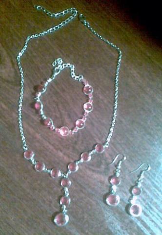 Papuosalu rinkinys; grandinele, apyranke (iskrite 2akutes, taciau nesimato nesiojant), auskarai (apie 4,5cm bendras ilgis auskaru)