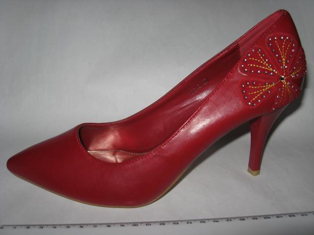 Raudoni (kiek į tamsesnę pusę) elegantiški aukštakulniai bateliai, su neiškilia gėlyte ties kulnu. Nebuvo nešioti.