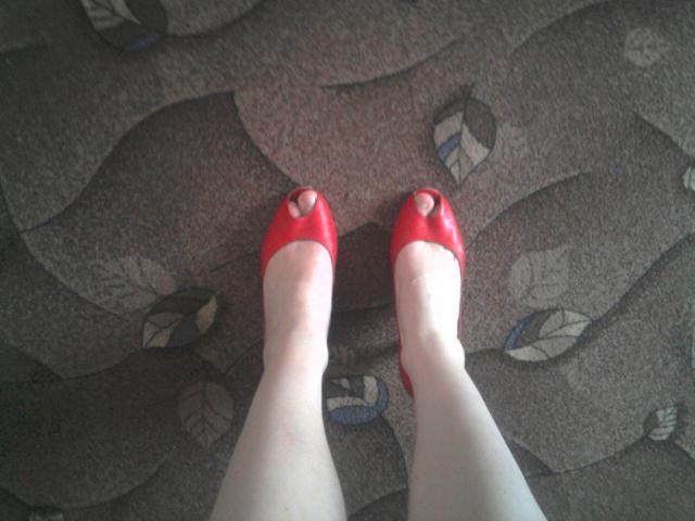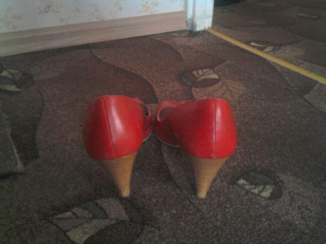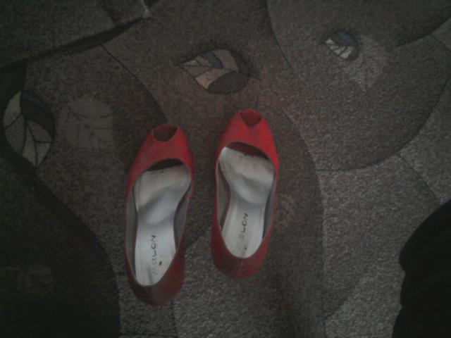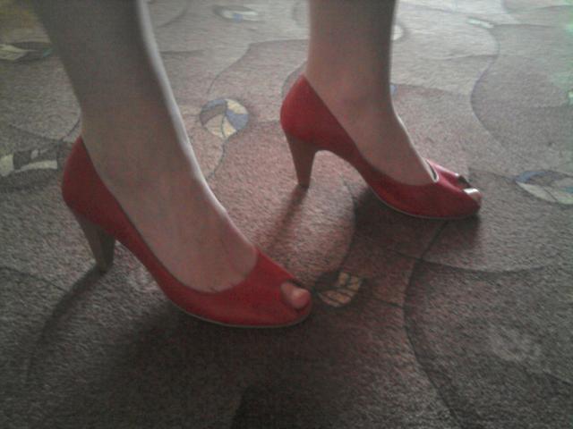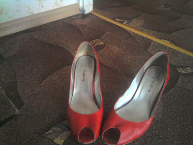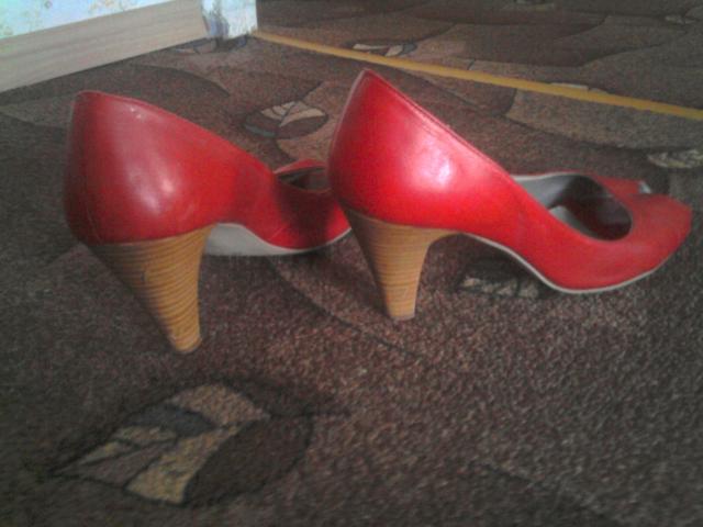 deveti bateliai,sodrios raudonos spalvos,ant gan neauksto kulno,patogus,nes kulnas nera storas.siek tiek nubrozdinti kulniukai,bet pakulniu kalti nereikia.ir siek tiek vietom apsitrynusi medziagyte.nepasakysiu tiksliai jie tikros ar dirbtines odos.dydis nurodytas 41,bet 40 kojai kaip tik,manau mazinti.dailiai atrodo prie bet kokiu rubeliu.bateliu vidus nera suplyses,uzkulnes sveikos