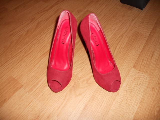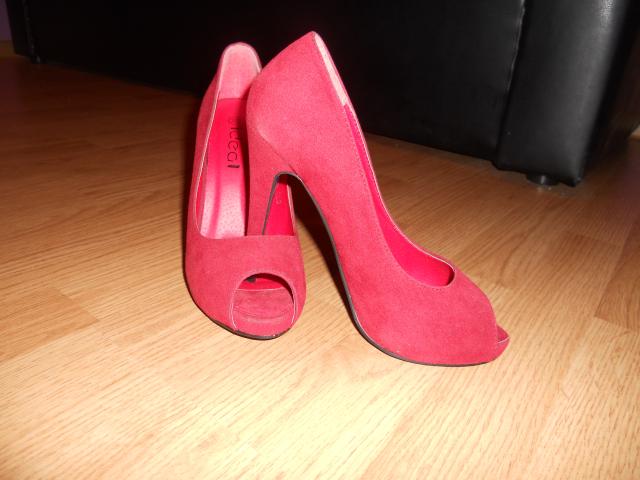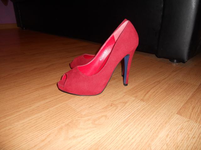 Puikūs nauji raudoni bateliai. Zomšas. Nė karto nedėvėti. Kulno aukštis 12 cm.