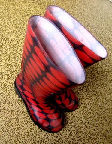Raudoni su juodais guzikais guminiai atai. Kokybe puiki. kadangi turiu dvejus, tai vienus nusprendziau perleist paneliai kuriai jie patiks dabar tokie orai tinkami guminiams batams!