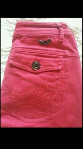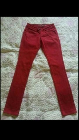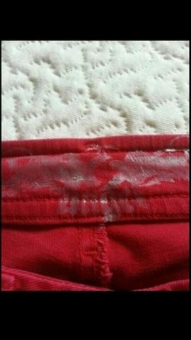 Issimaiciau cia bet buvo mazos:/ Raudoni džinsai. Dėvėti. Dydis S/M. Bendras ilgis apie 107 cm, nuo klyno apie 84 cm. Juosmuo 2*33 cm, klubai apie 2*47 cm. Defektai: nusiskalbus etiketė kelnių viduje nugaroje (paskutinė foto).