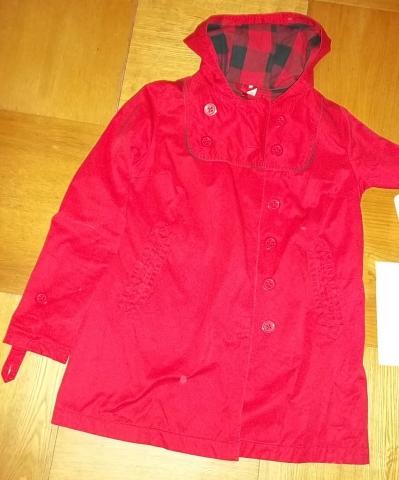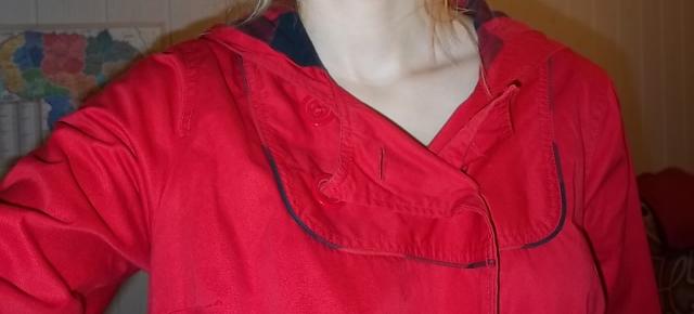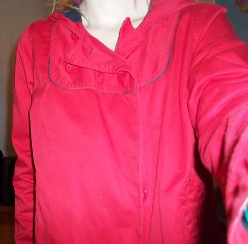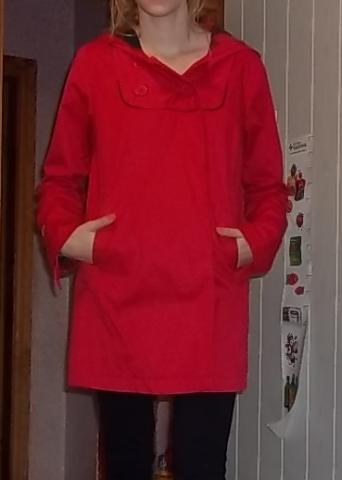 Raudonos spalvos pluoščiukas, 100%polisterolis.( pati nešioju 12 dydi.) yra kapišonas, kišenės.
