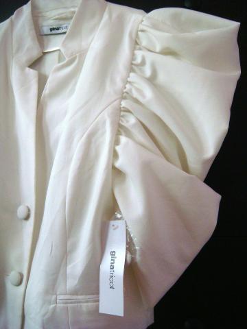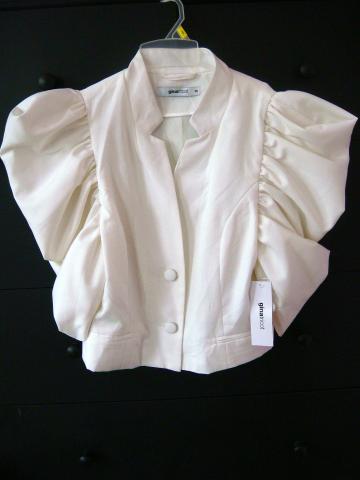Baltas labai stilingas, universalus švarkelis, tinkantis dėvėti oficialiuose renginiuose ar susirinkimuose bei triukšminguose vakarėliuose. Labai gražu prie įdegusio kūno. Rankovės labai pūstos pakelti petukai ir ilgis iki alkūnės. Atsarginė saga. Topinis švarkelis. be defektu.