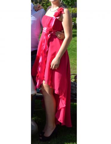 Rausva proginė suknelė. Buvo nešiota tik vieną kartą - per vestuves dėvėjo pamergė. Suknelė be defektų. Jaunatviška, ryški spalva. Priekyje trumpesnė, gale ilga. Gale suveržiamas korsetukas, todėl puikiai tiks įvairioms figūroms. Dydis 38/40